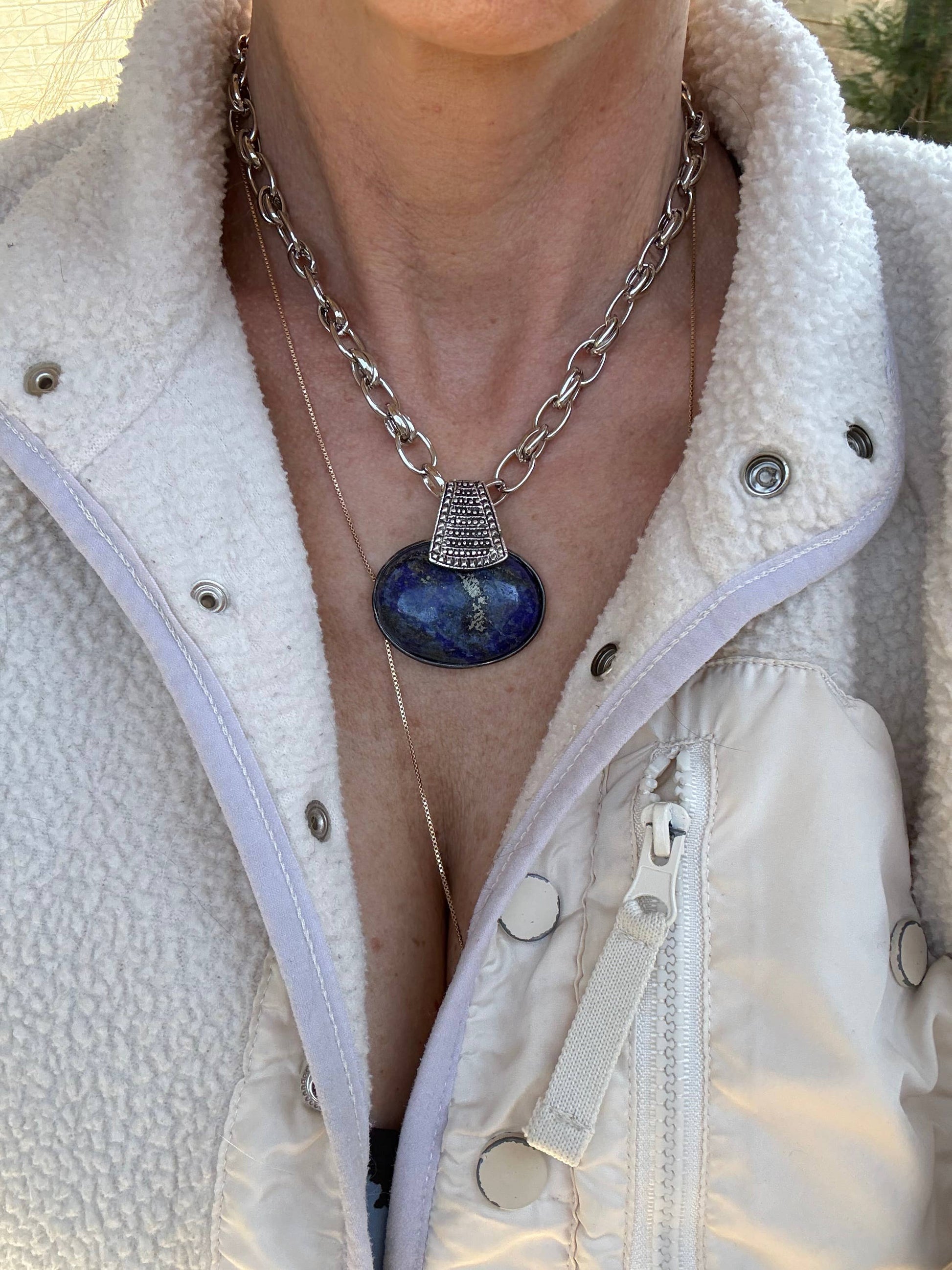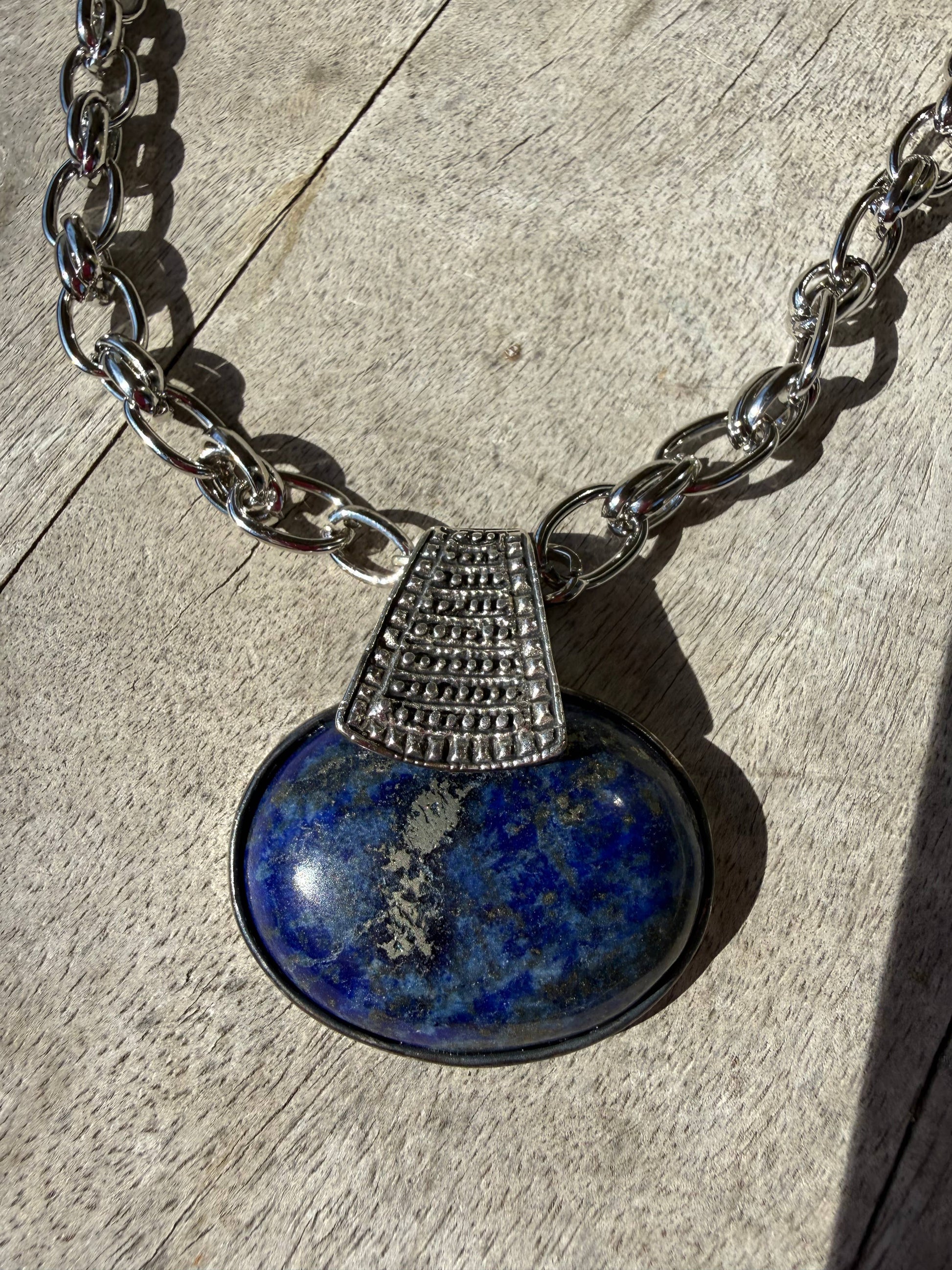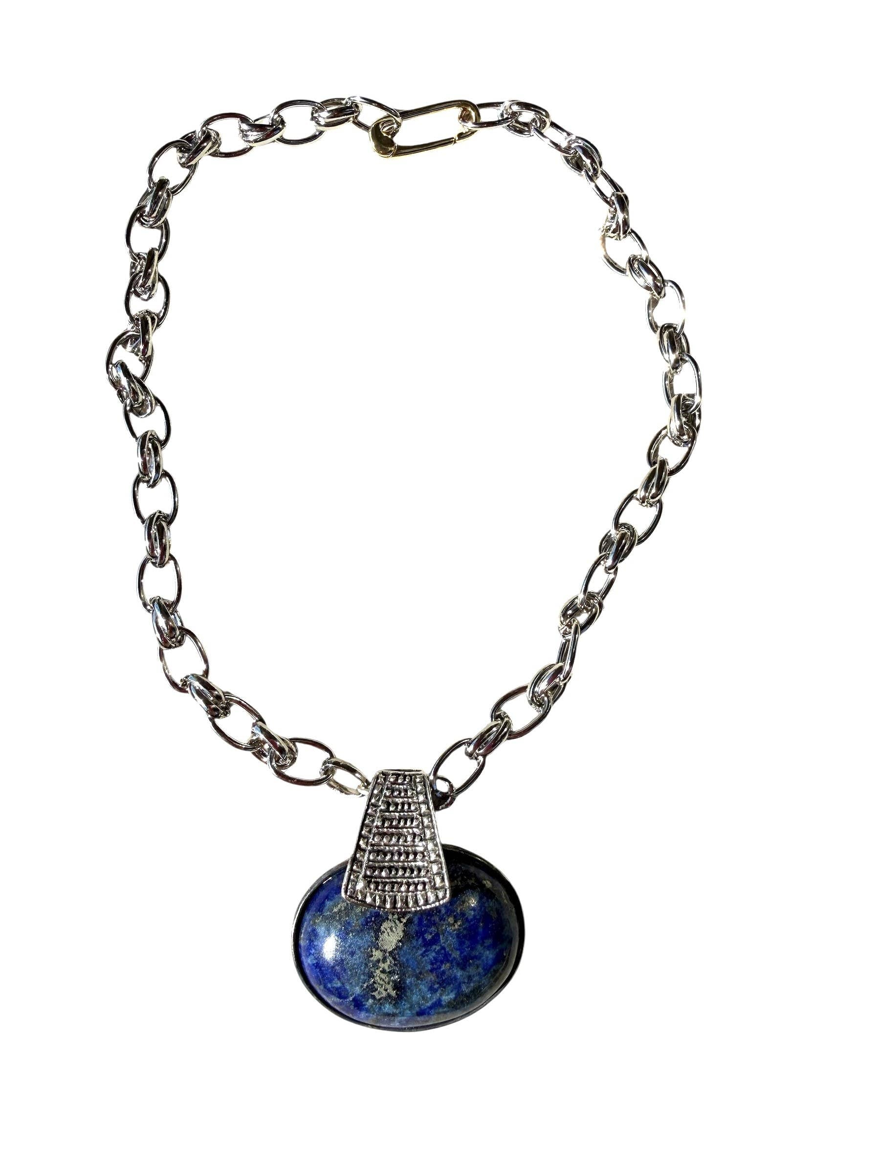 Large 2.5" wide pendant with silver pewter bezel and ornamental bale, lays perfectly on this mixed chunky silver plated chain. Genuine stone, real power, stoic, inner power, inner strength, humble yet confident, that is lapiz. large hook clasp, choose lengths below. Shown on model in 15.5-16" length.