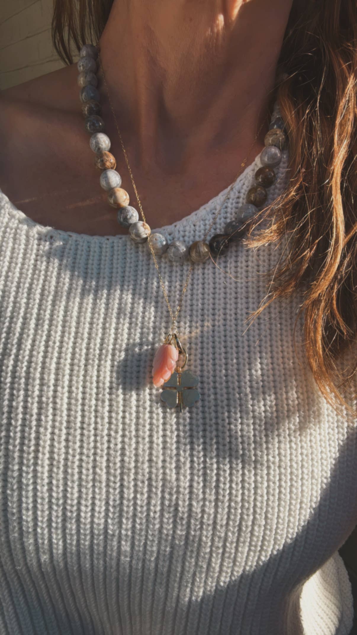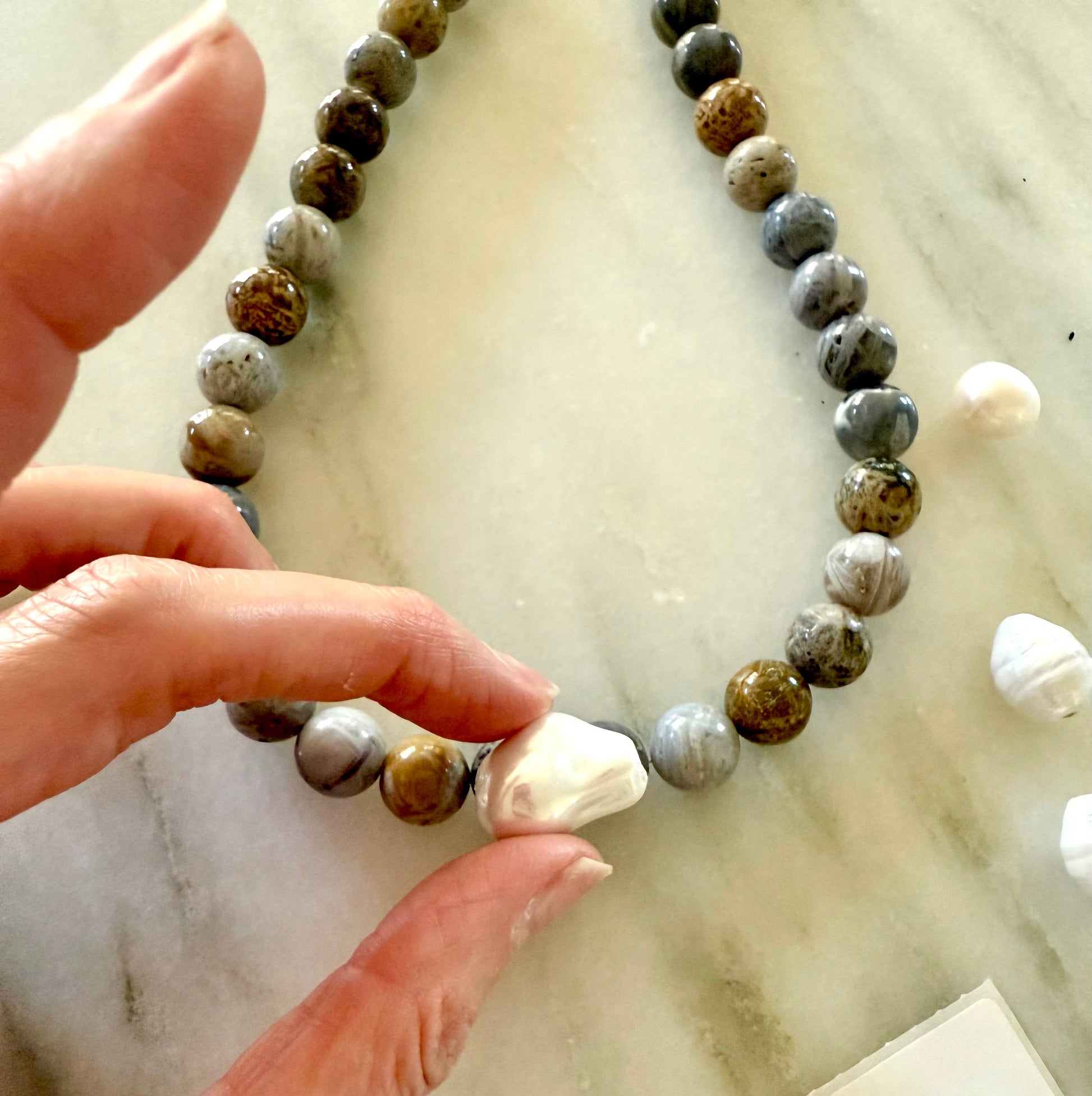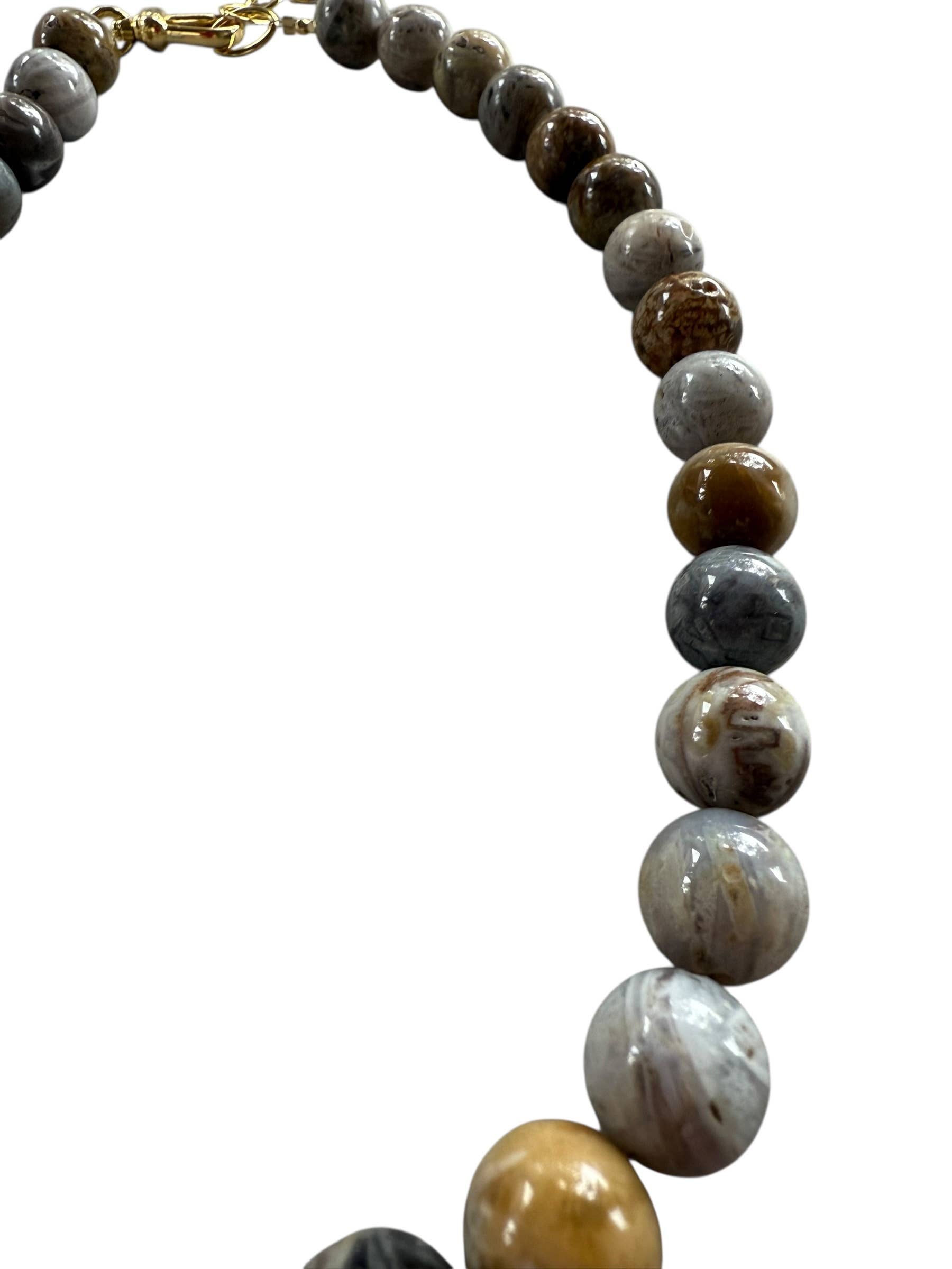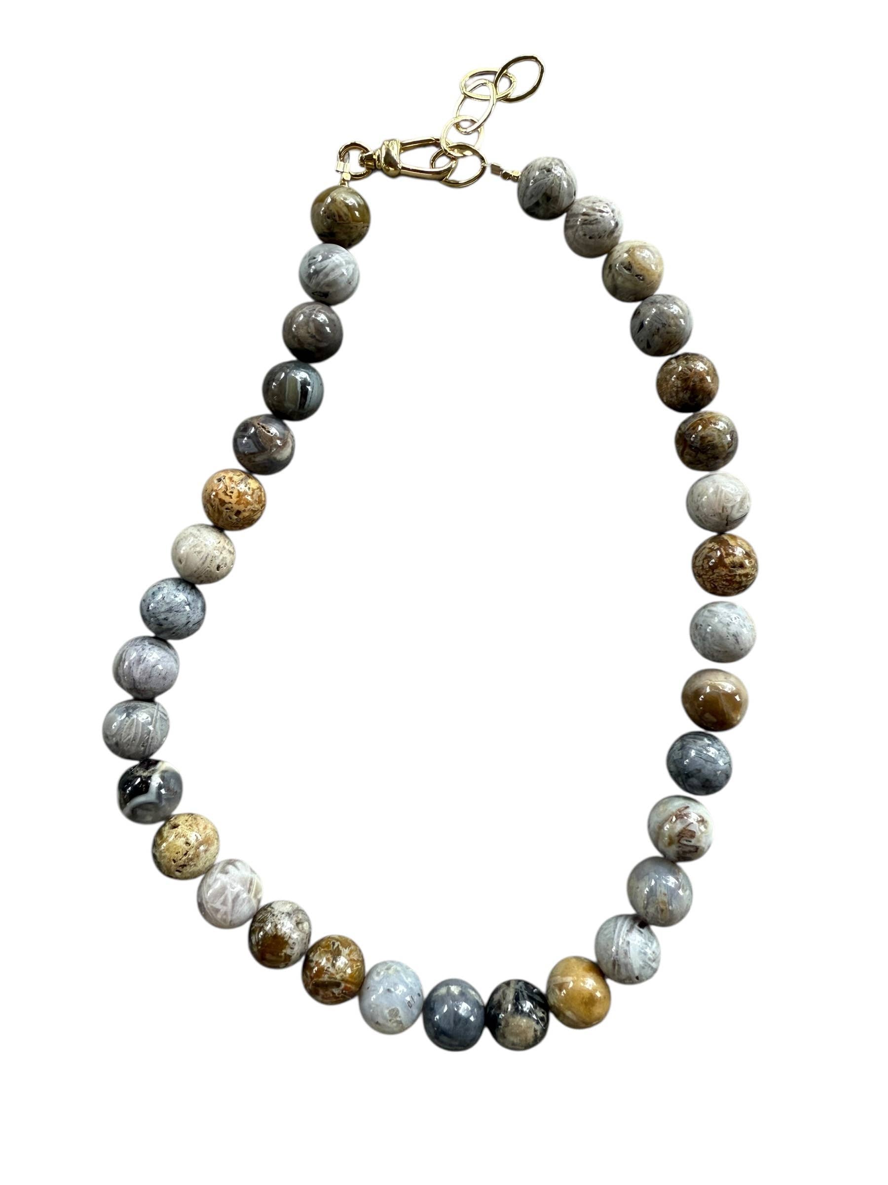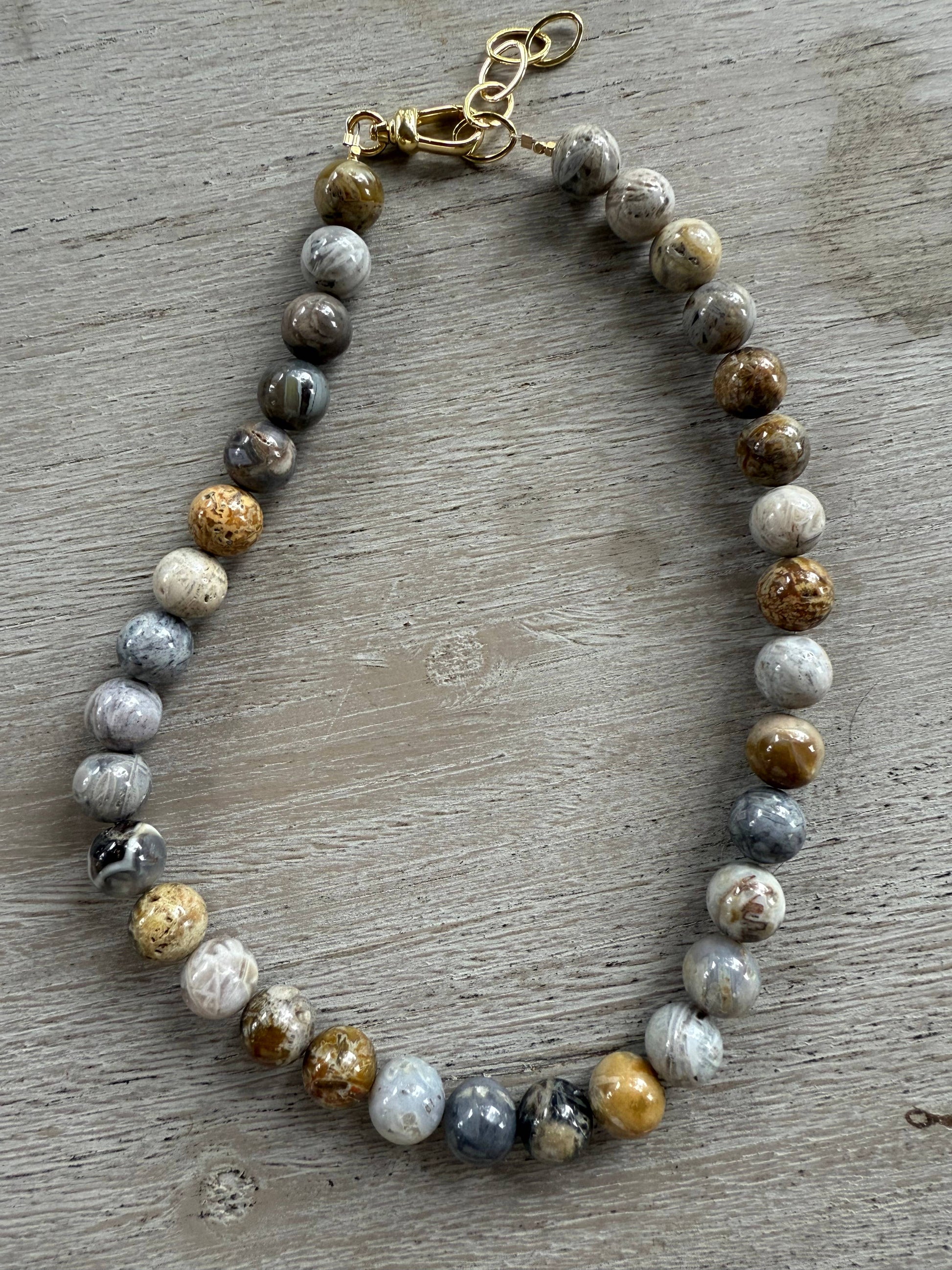 I fell in love with this fall stone! Beautiful tones of greys and light browns, every bead is unique and it's called bamboo leaf agate. Comes with a large Lobster hook and 2" extender built in for 16-18" length. You will love her!