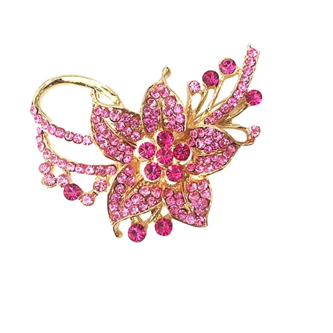 Elevate any look with our Brooch Collection—a curated assortment of radiant, vintage-inspired brooches designed to sparkle from every angle. Featuring intricate floral silhouettes, teardrop crystals, and high-shine finishes in silver, gold, and blush tones, each piece is made to stand out. 3" across pink and gold