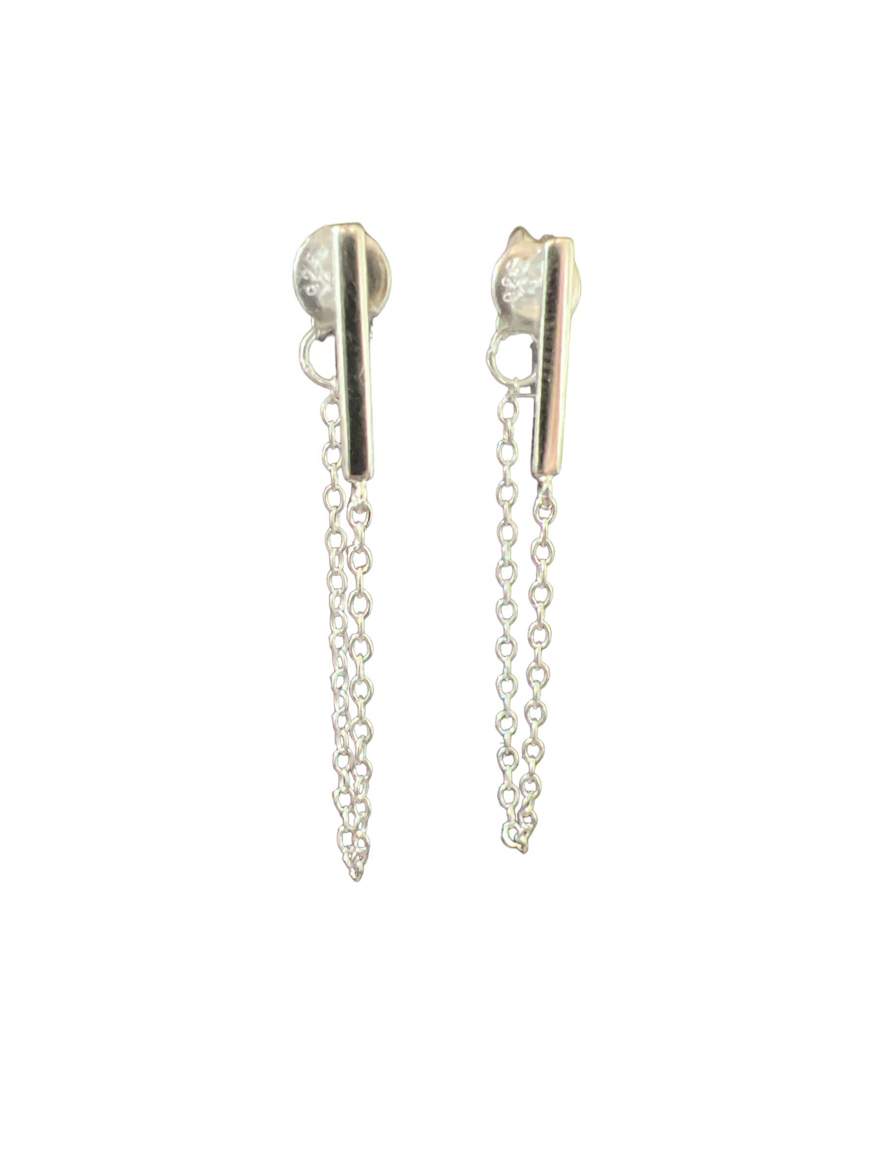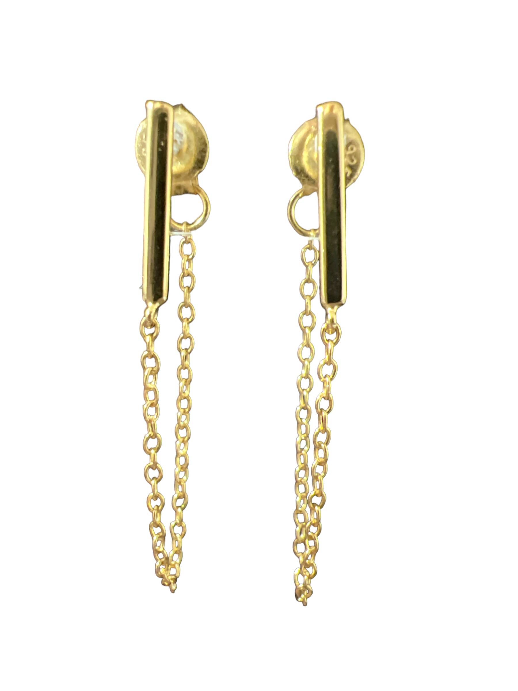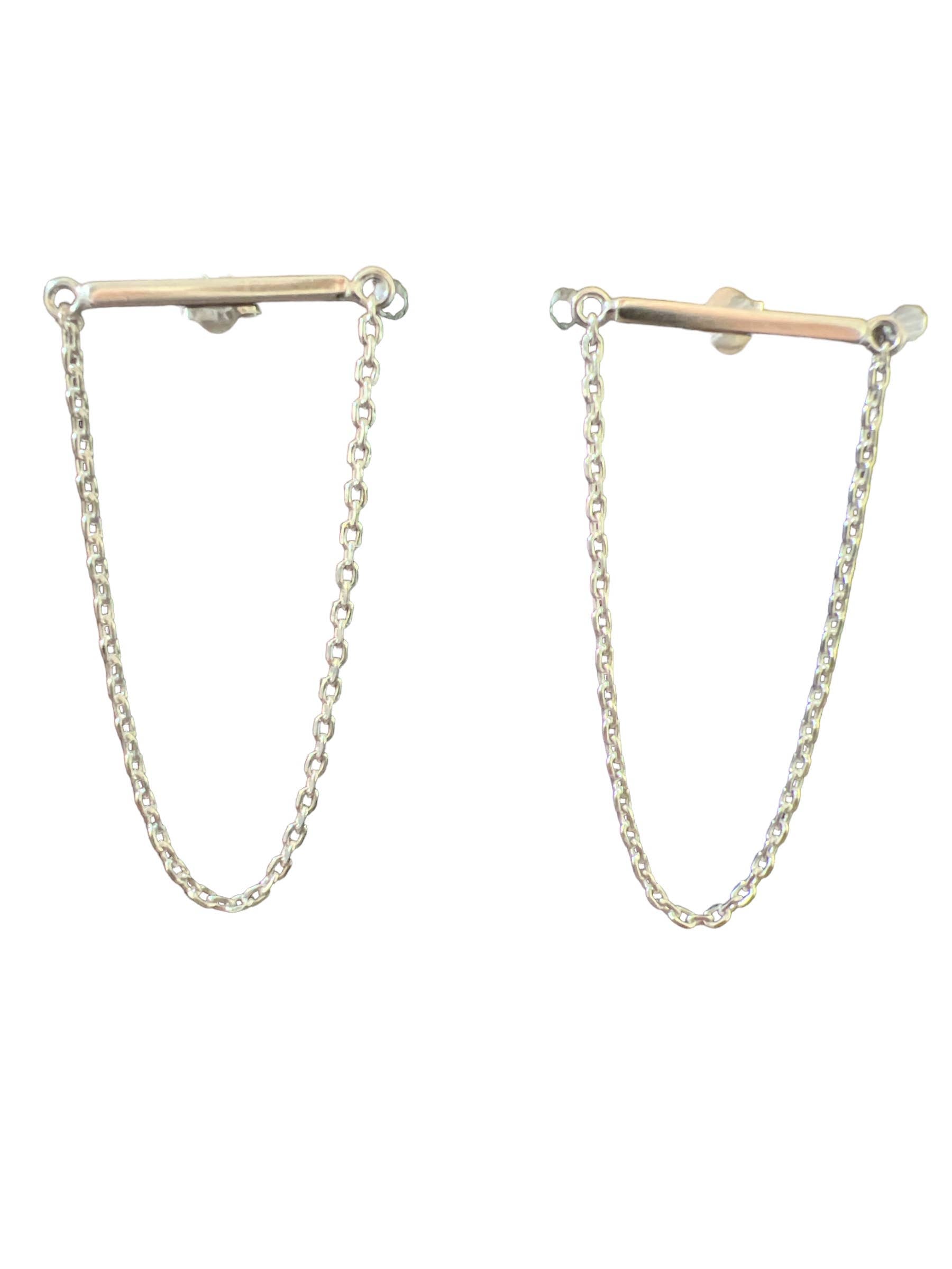 Delicate yet edgy, sweet and bold, lovely chain and bar stud earrings. funk them up with earring layers.......... sterling silver and gold vermeil. See the "Flo" for a slightly different horizontal bar version. 1.5" in length, post goes behind the ear but is attached to the chain.
