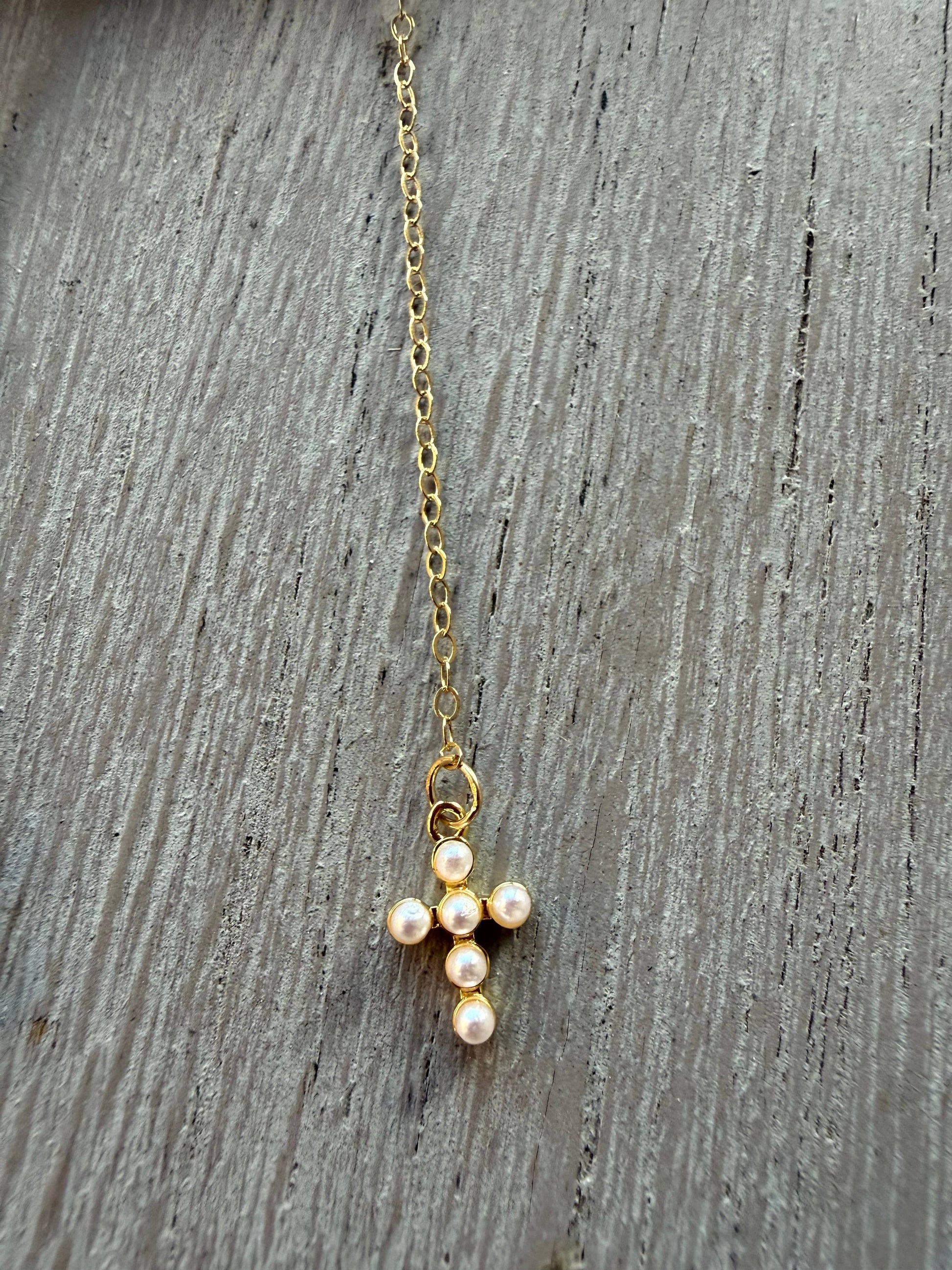 Timeless faith meets delicate beauty. A petite cross adorned with tiny faux pearls hangs from a fine 14kt gold-filled chain, creating a piece that's both meaningful and refined. The miniature scale and lustrous pearls make this perfect for everyday wear or thoughtful gifting. 14kt gold filled with a 2" extender.