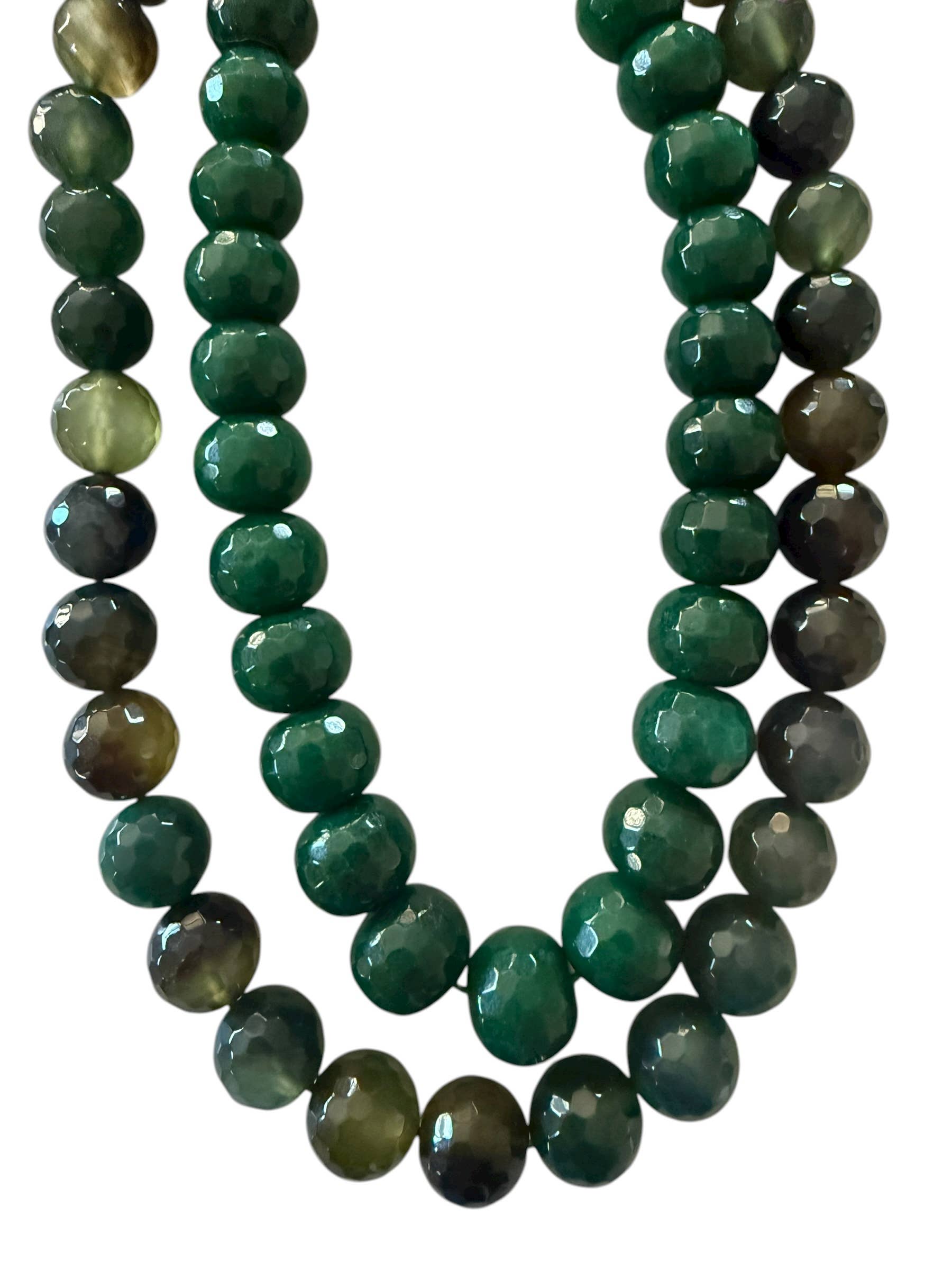 Faceted Agate, two options came back in green.. select below. Toggle clasp 16-17", 12mm or 12mm with a slightly roundell shape