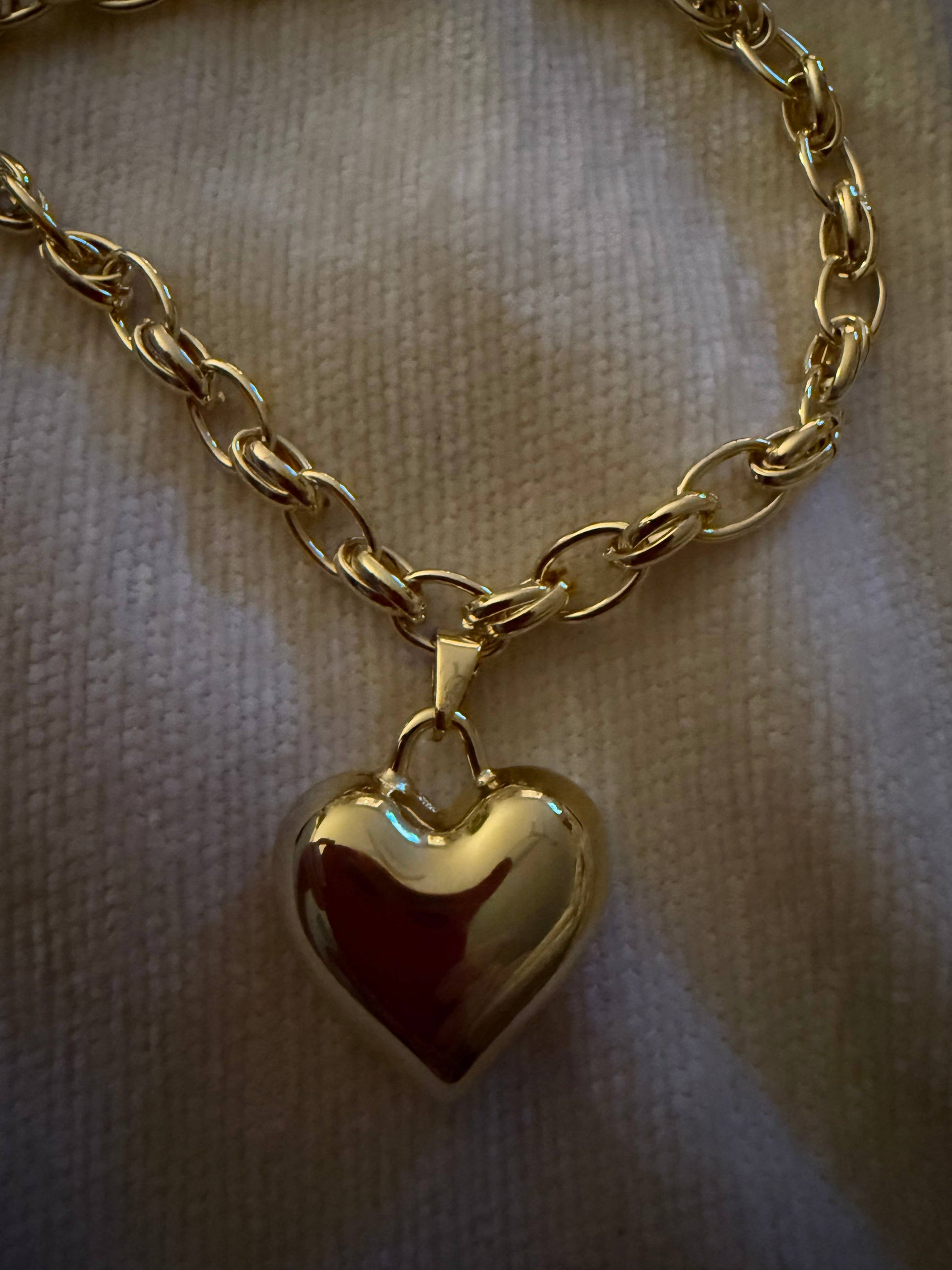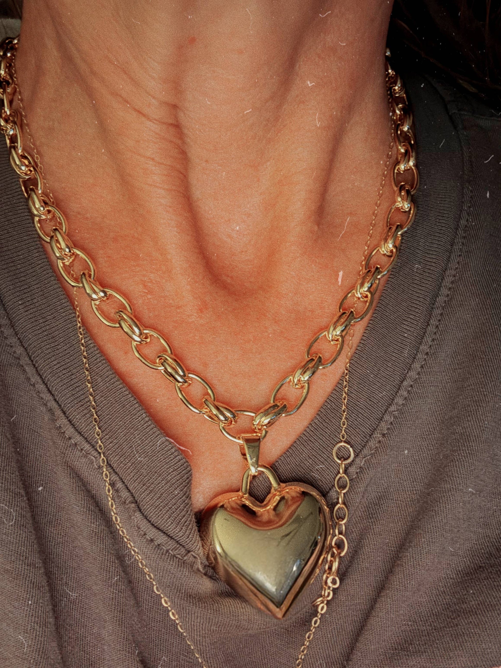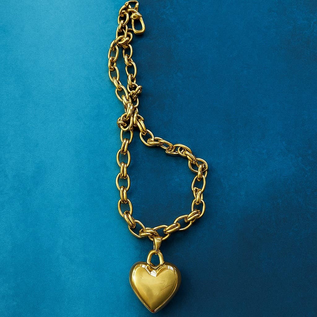 This statement heart pendant drops from a chunky link chain that catches the light (and compliments) from every angle. Plated for lasting shine, this 16” adjustable stunner adds instant attitude to any outfit—whether you’re layering it up or letting it steal the show solo.