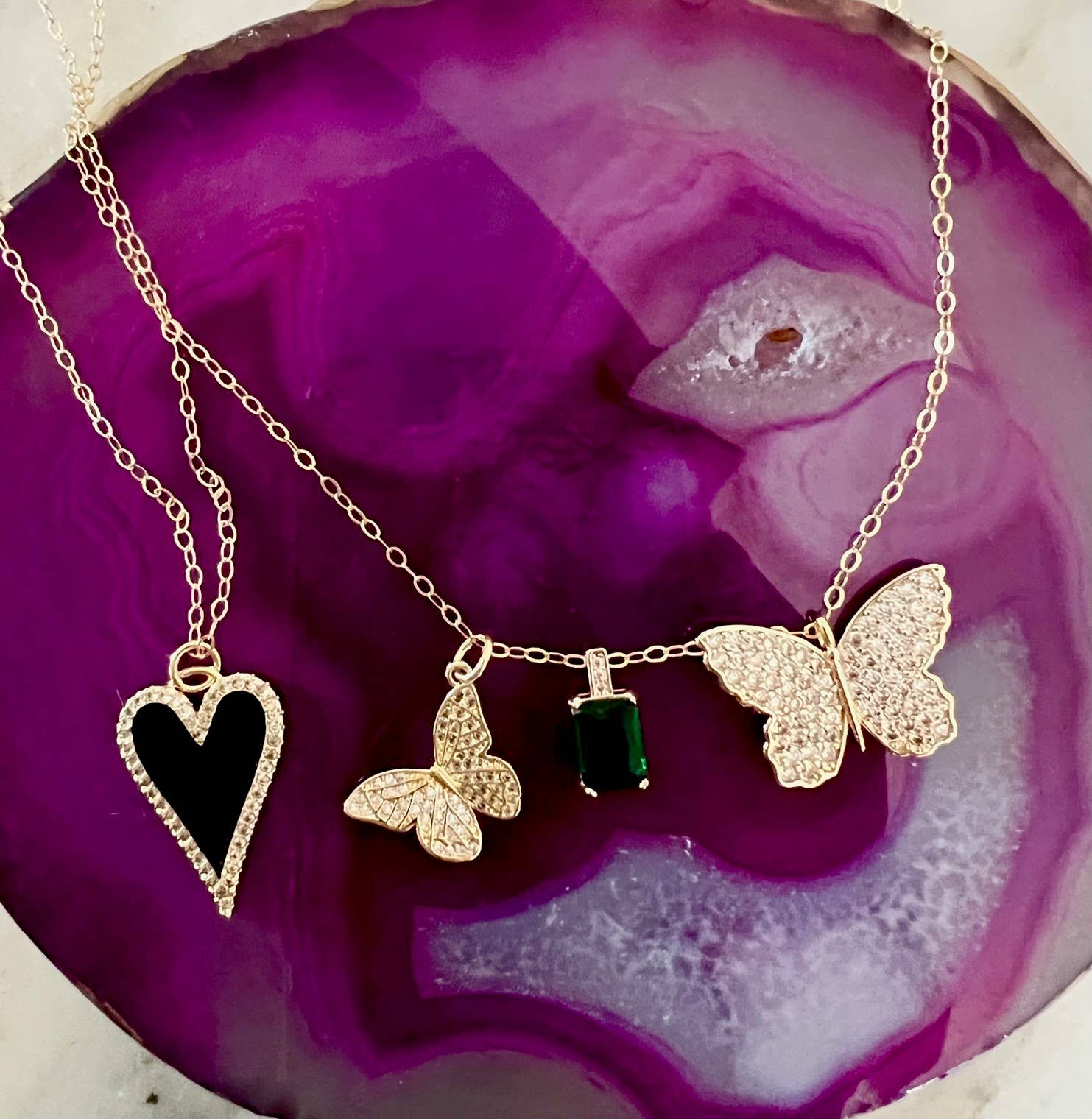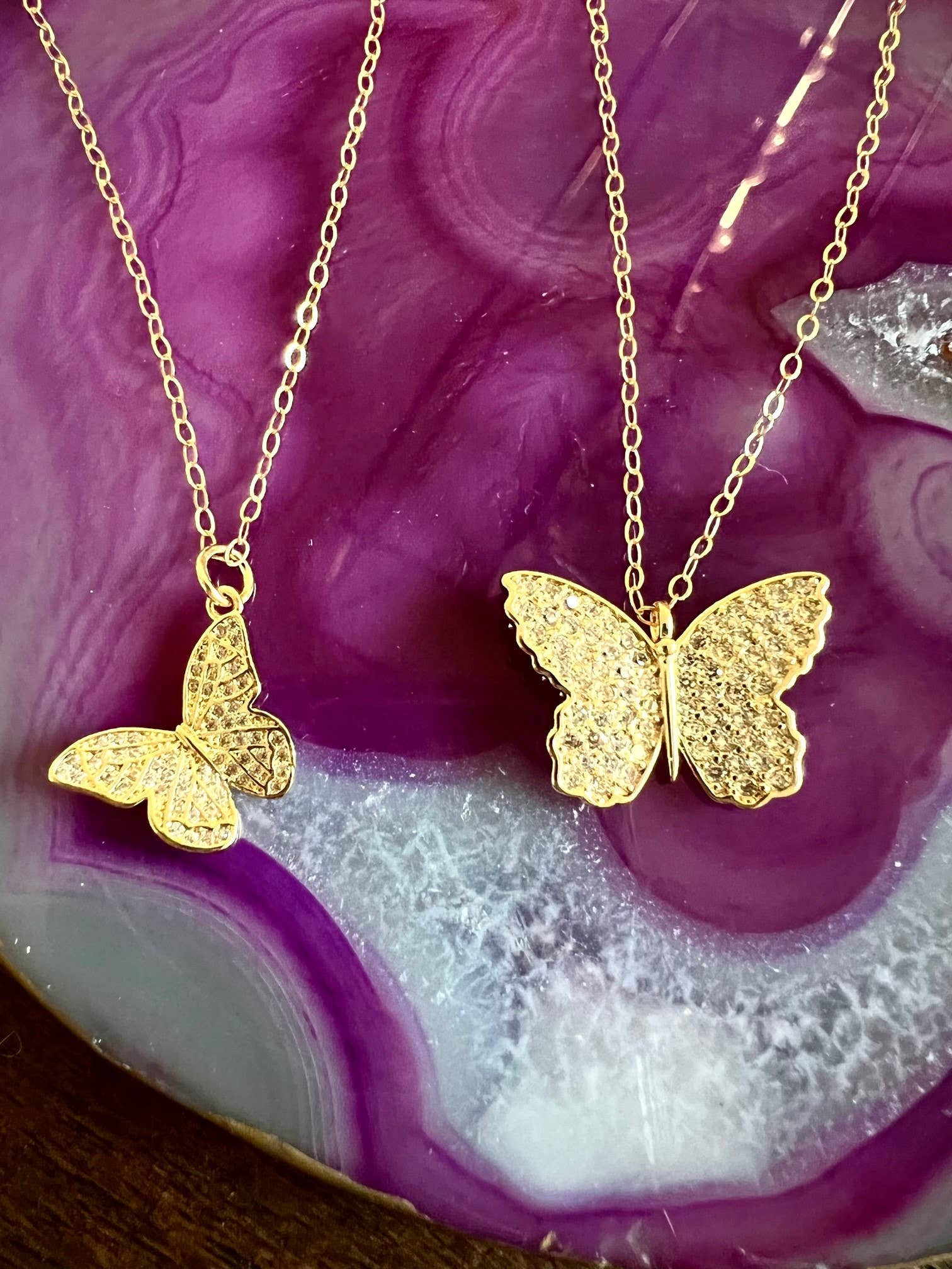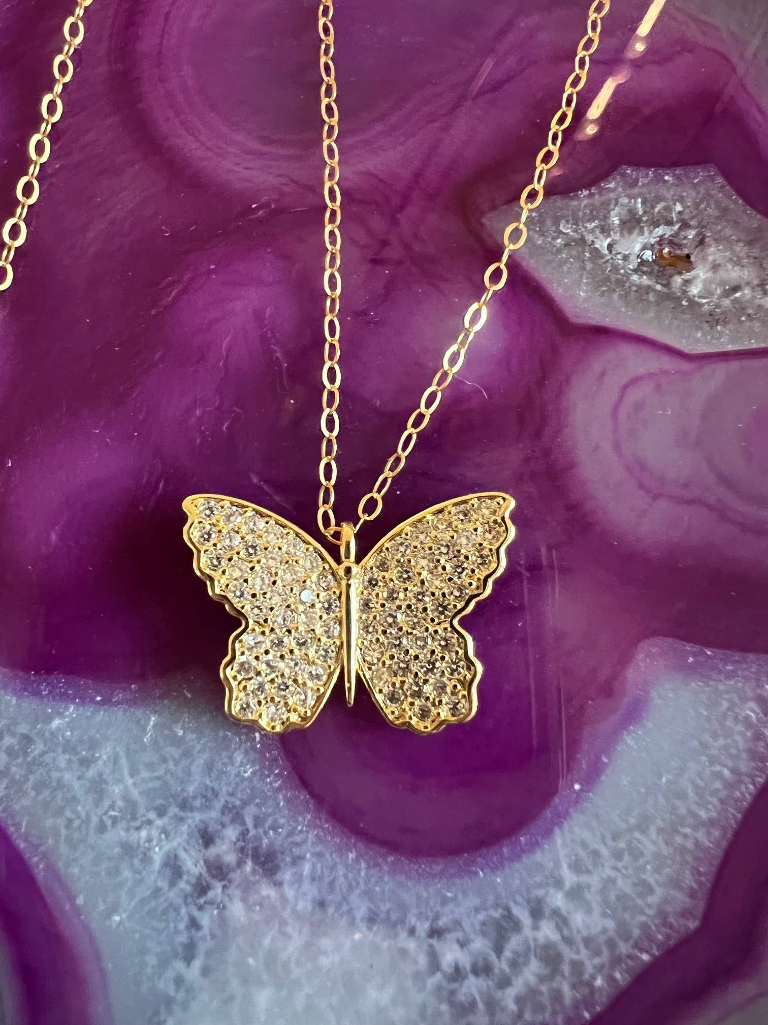 Adorable front facing large size cz and brass plated butterfly charm, about 1" width comes on a 15.5" - 18" 14kt gf chain, see our other butterfly options as well.