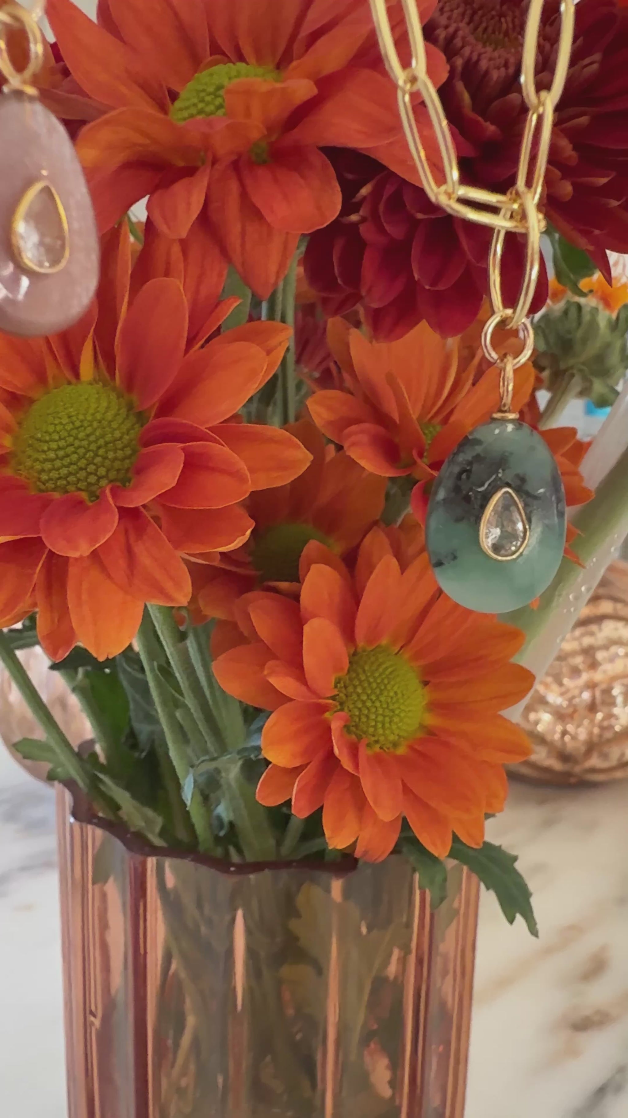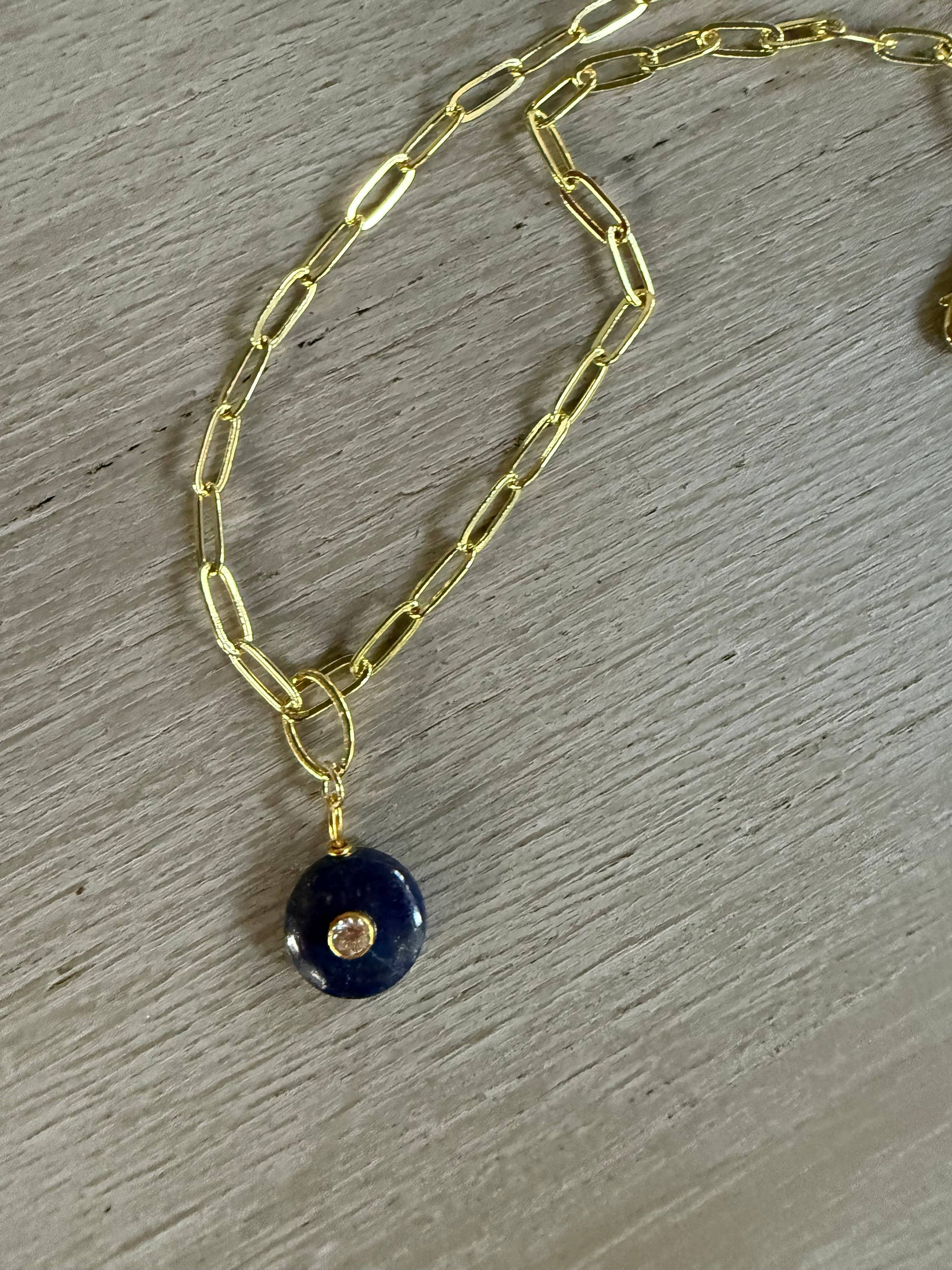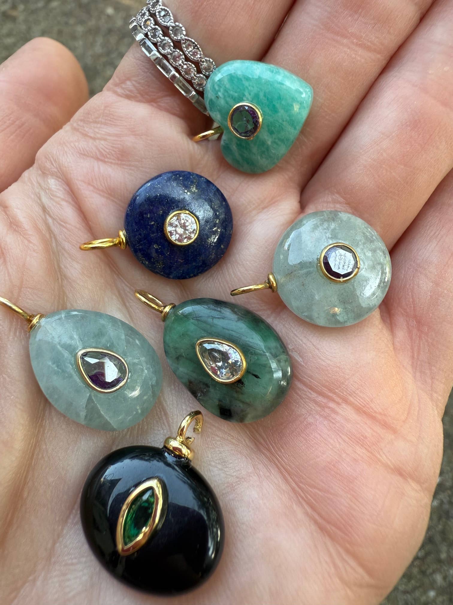 A bold lapis lazuli, an aventurine heart, an aquamarine oval, a brown moonstone oval, and a beautiful green Sakota Emerald oval pendant accented with a delicate center stone, set on a modern gold paperclip chain. Perfect for adding a touch of elegance with a hint of color.