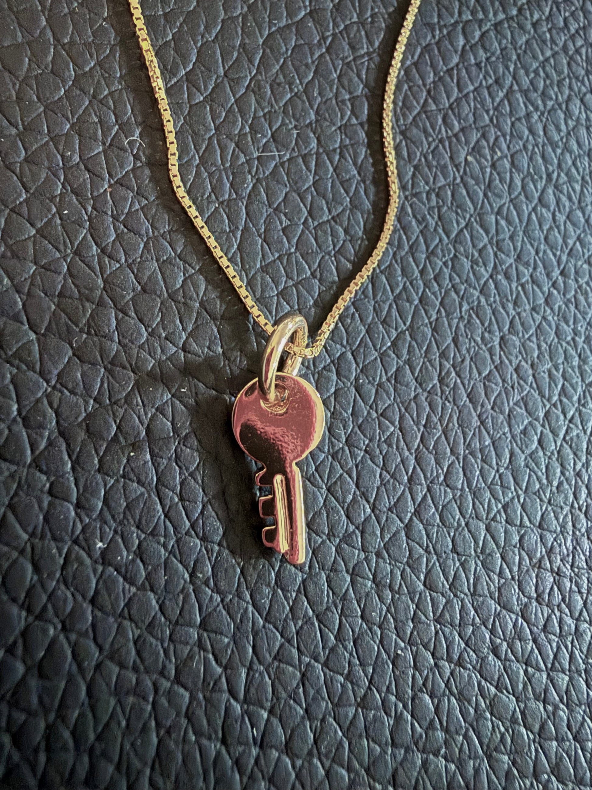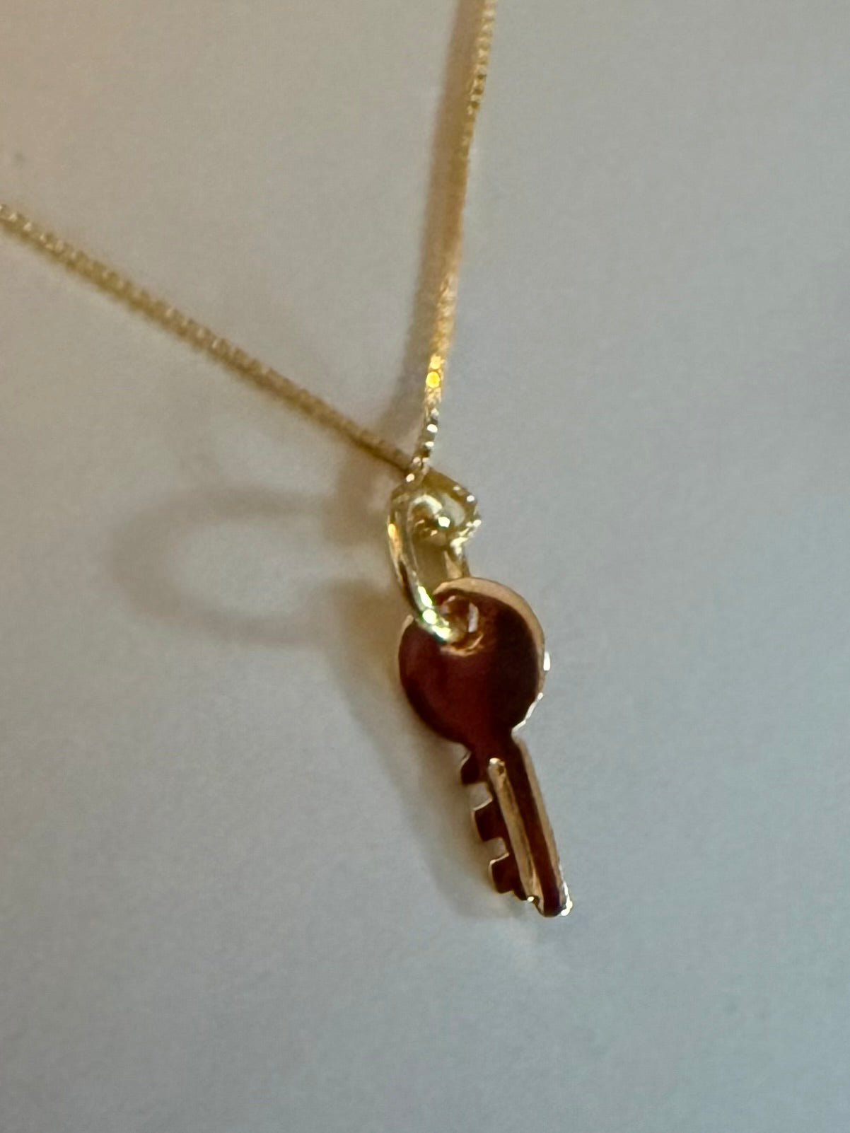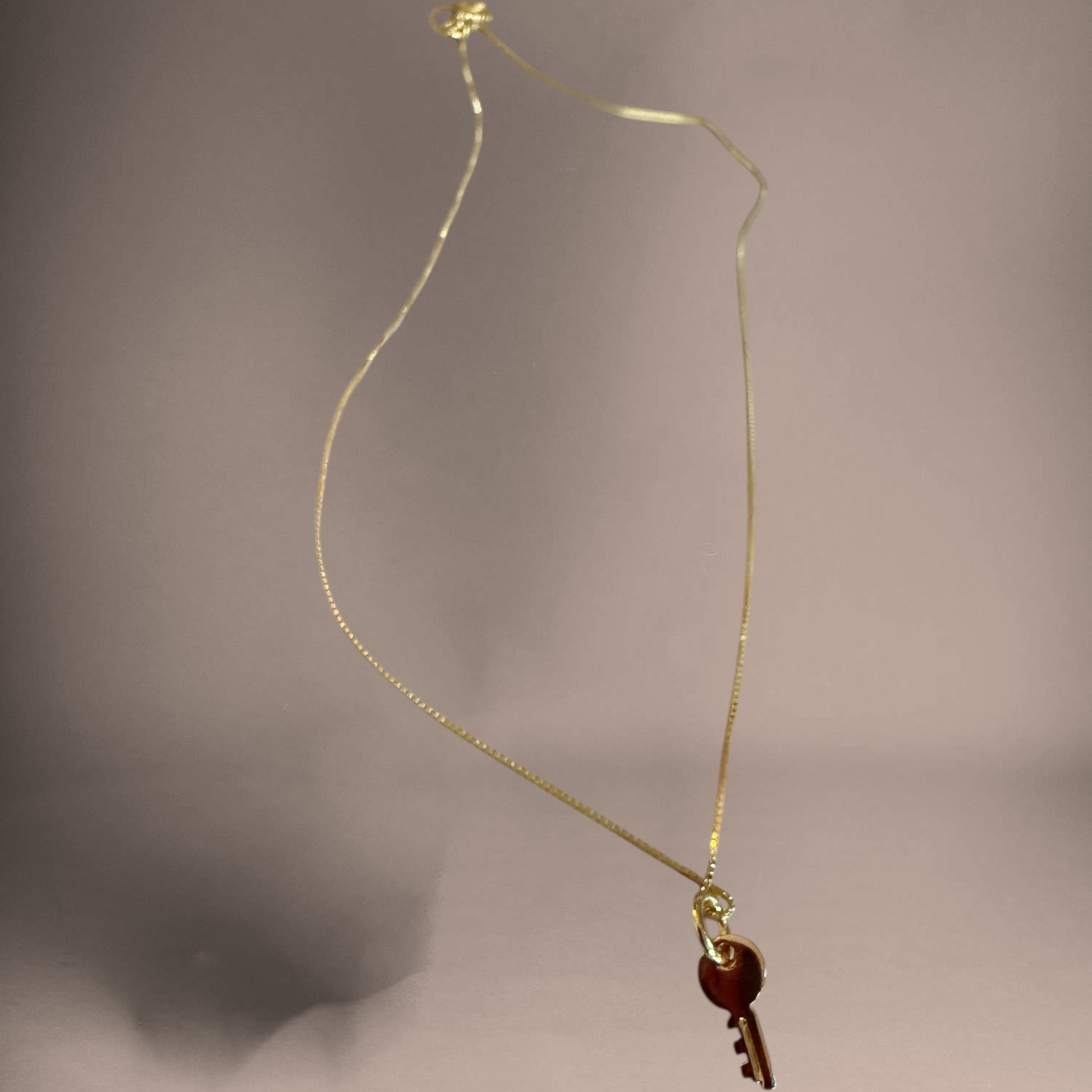 16” gold vermeil silky snake chain with tiny key charm. Sits beautifully on the clavicle.