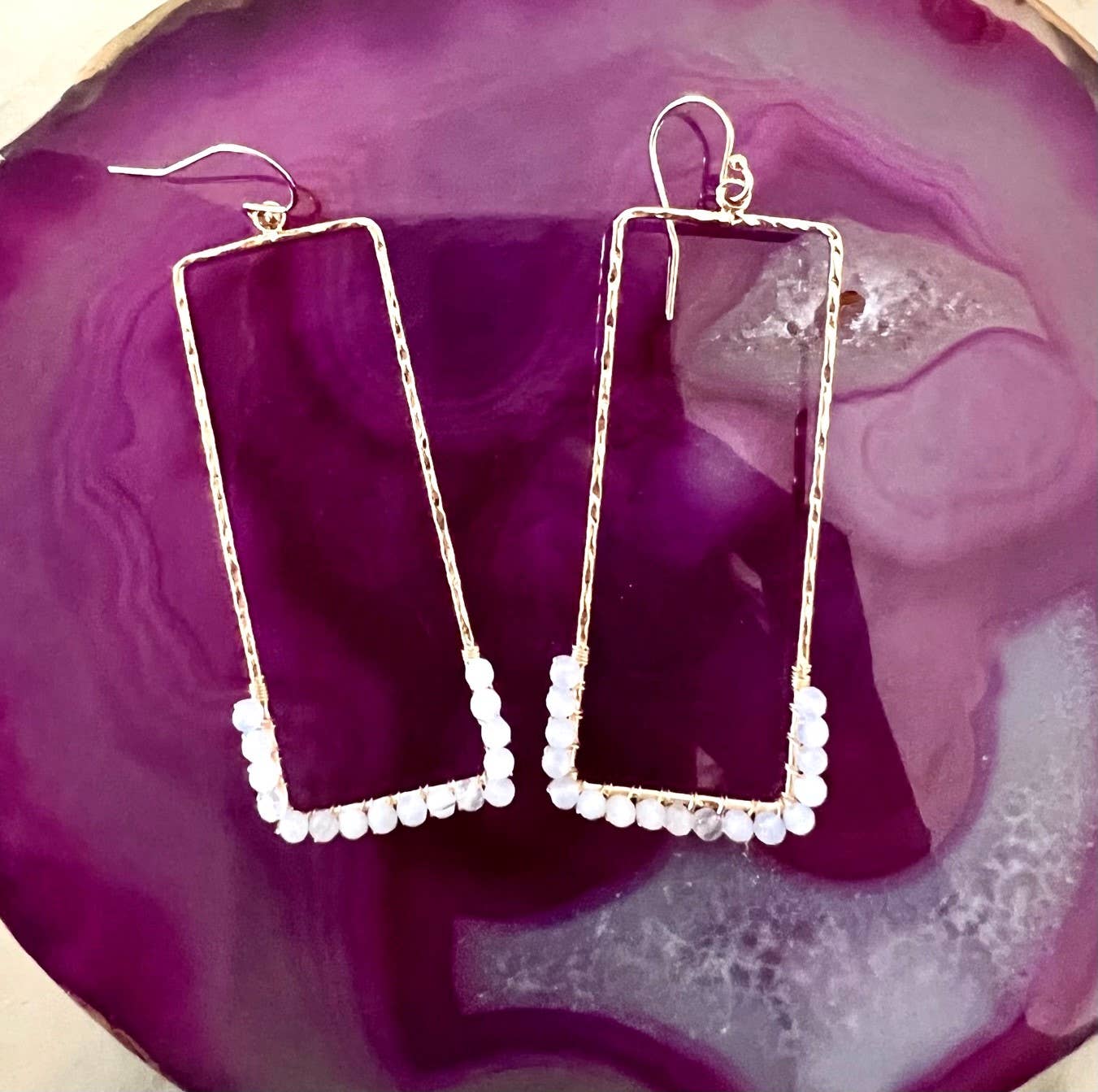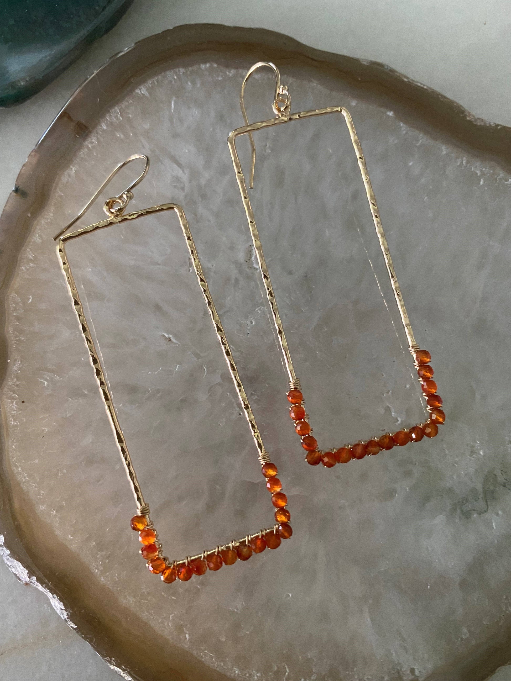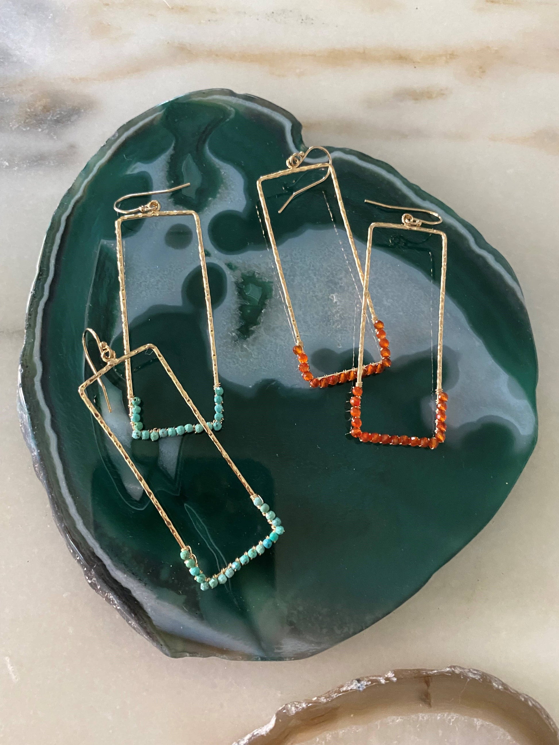2 1/4" in length, plated finding, gold filled ear hooks, wire and semi precious gemstones, choose from assorted gems below. Feather light in weight.