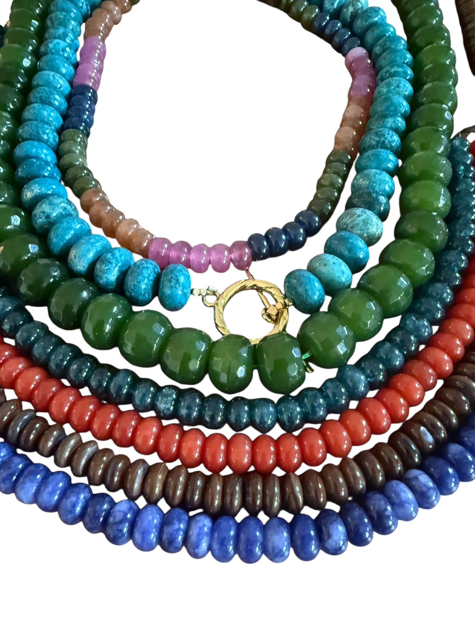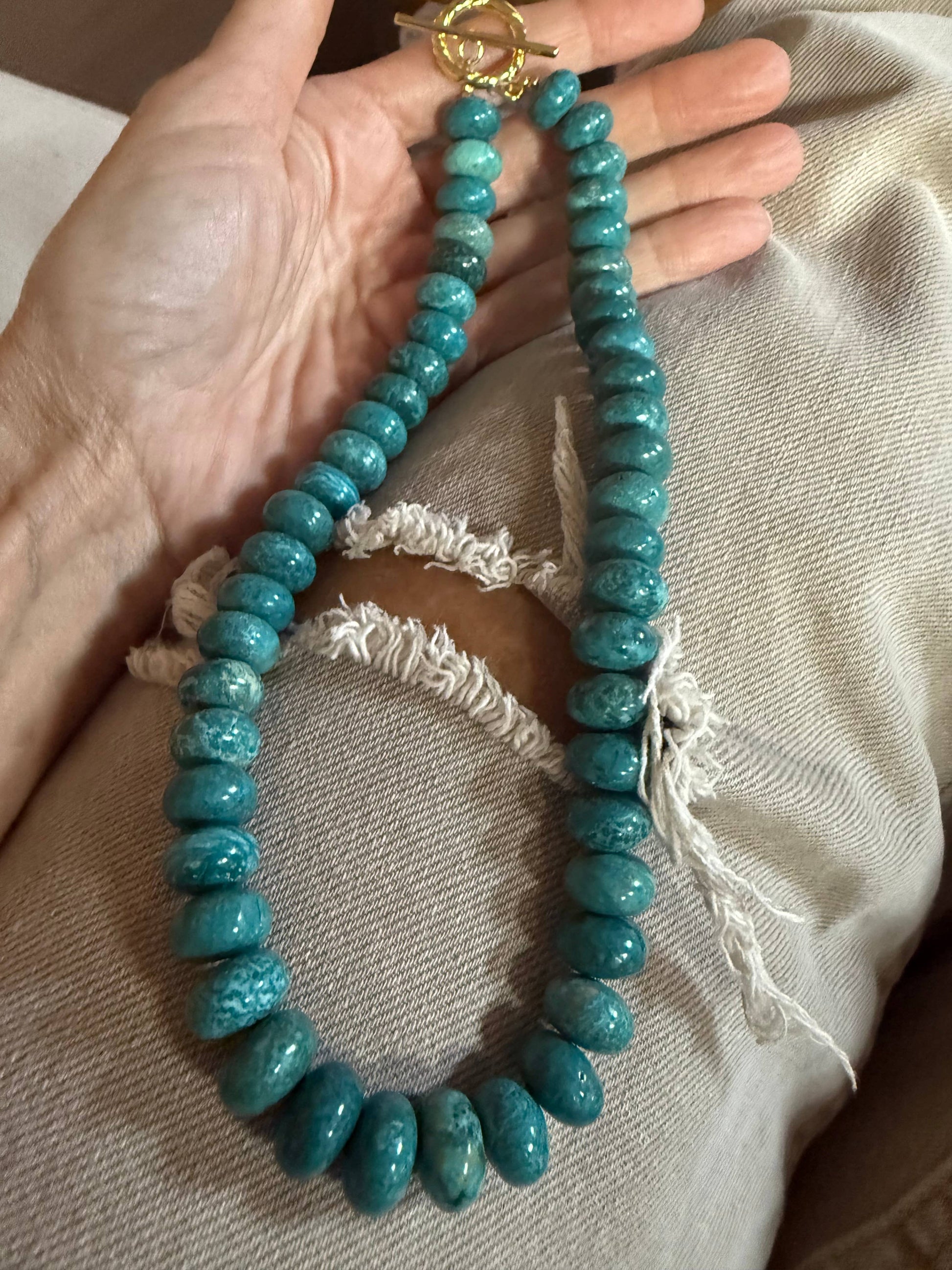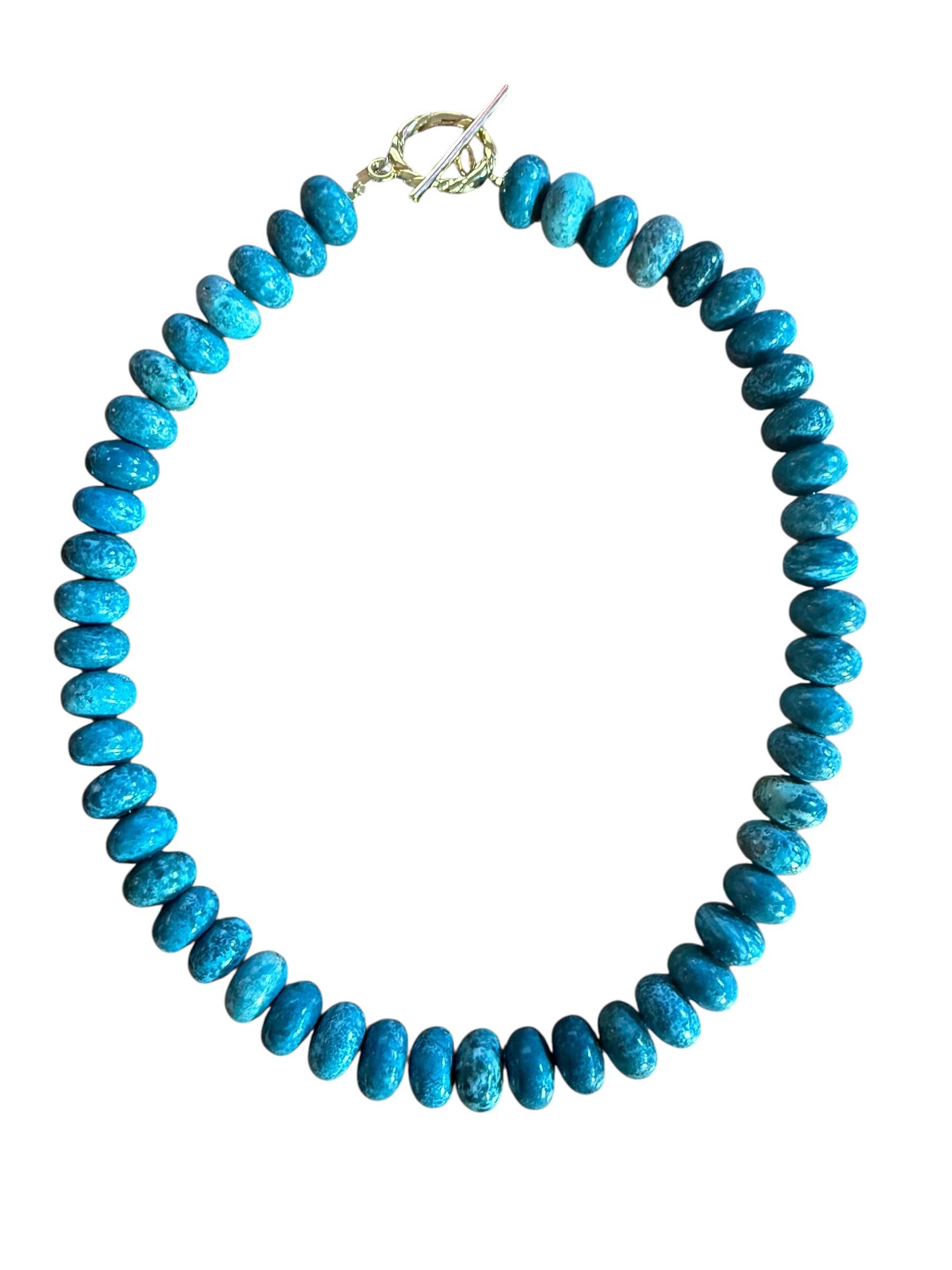 12mm roundels, stunning turq magesite stones with large toggle. brass plated.