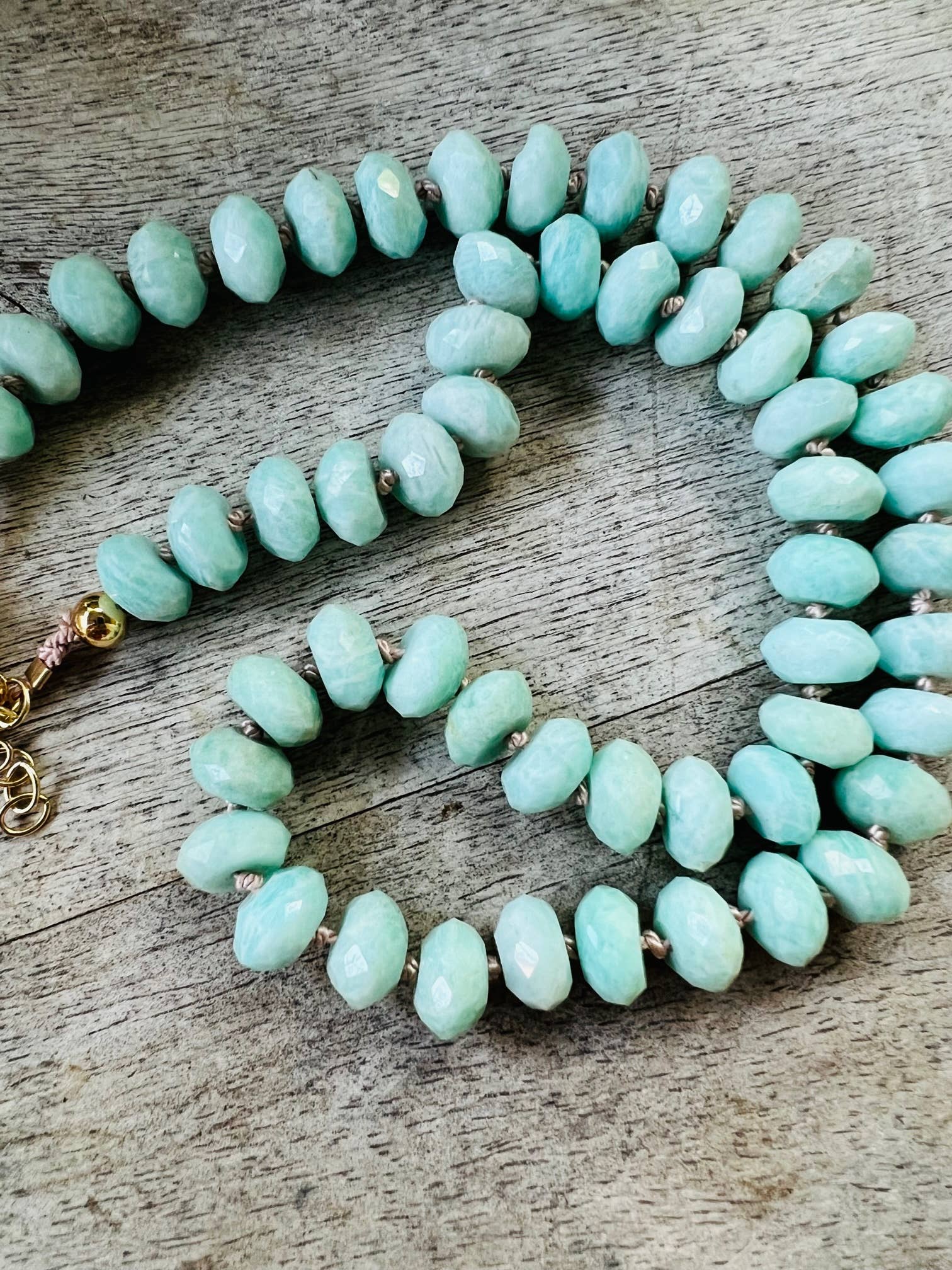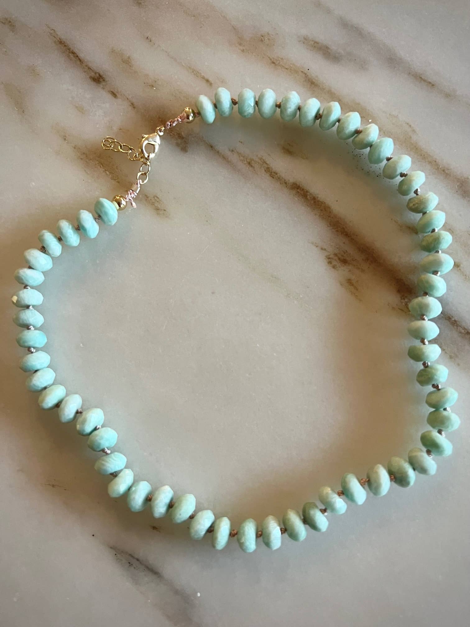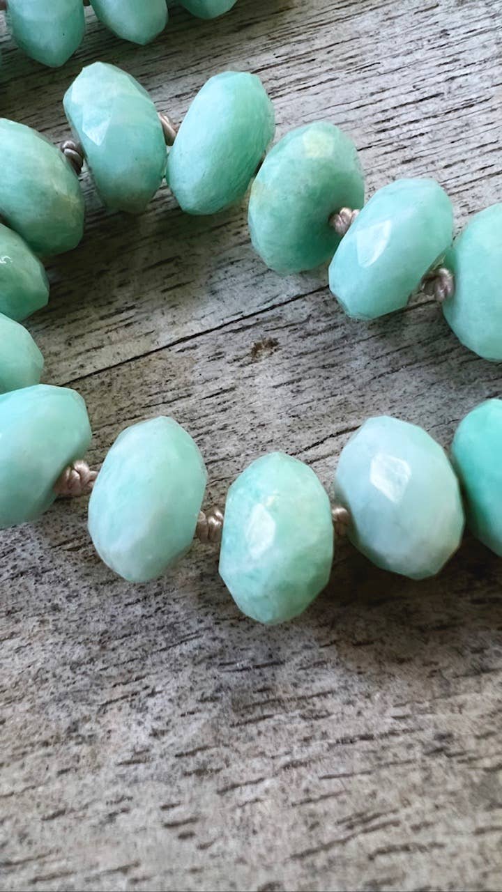 This one is made with light pink thread in all faceted 9mm peruvian amazonite, designed by a fashionista we decided to include it in the line because of how well it turned out.