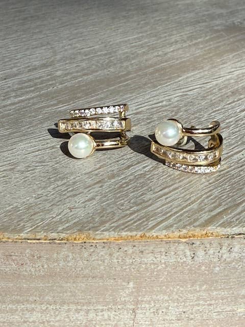Where glam meets edge: triple loops, CZ shimmer, and a faux pearl pop—all in a gold-plated stud that sits snug on the ear. Your new statement staple.